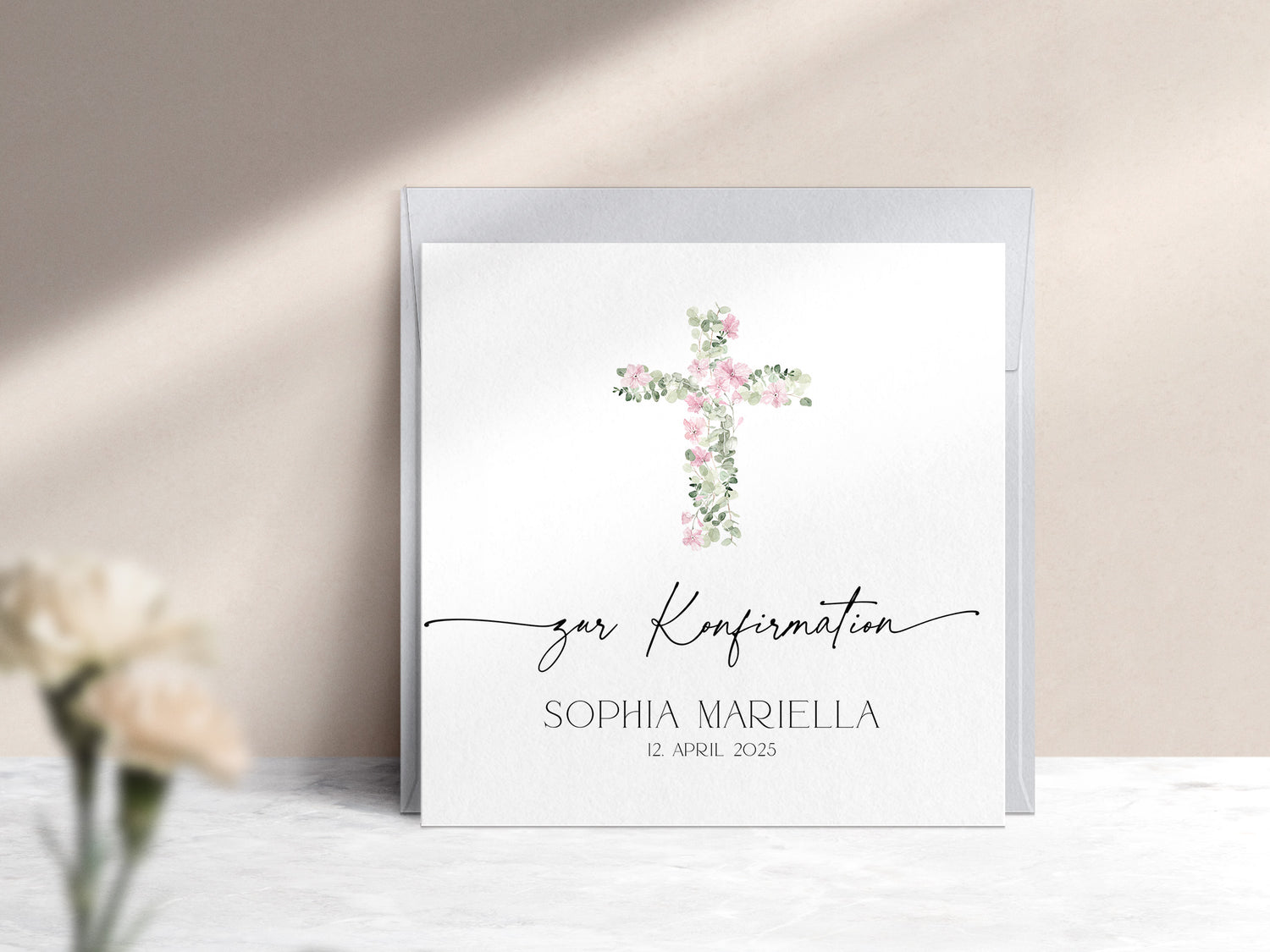 Moderne Karte zur Konfirmation mit rosa Kreuz