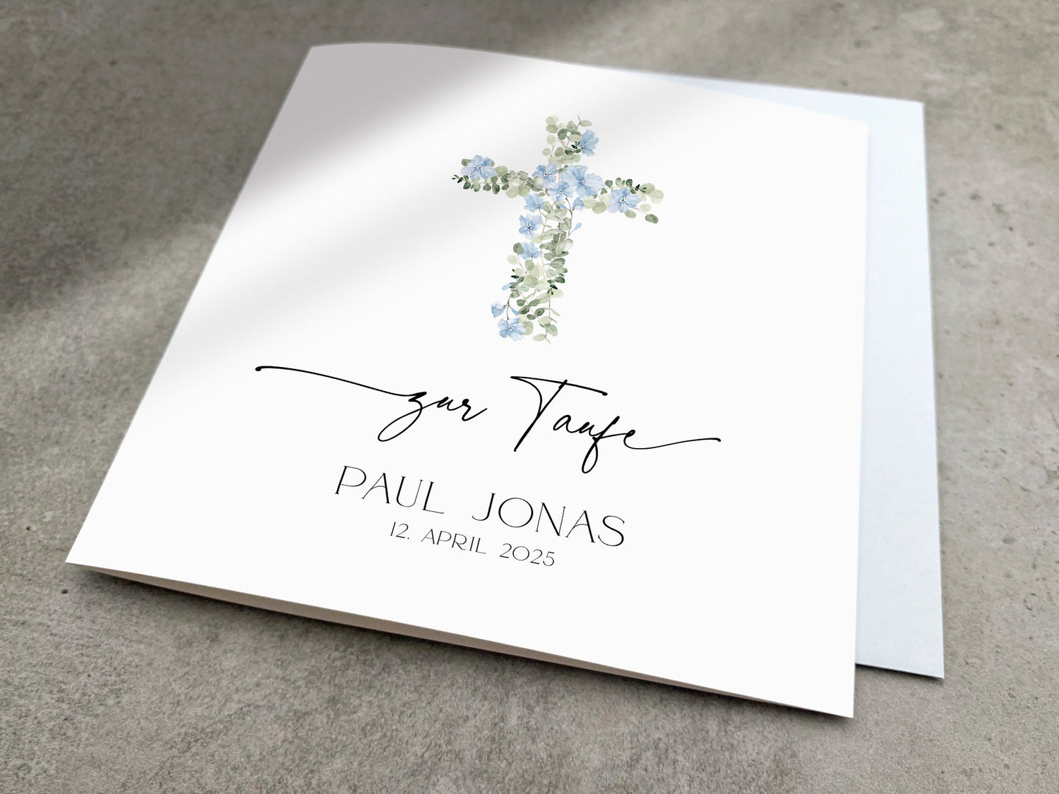 Du kannst die Karte mit dem Namen des Täuflings personalisieren lassen. Wenn du möchtest kannst du auch das Taufdatum dazu schreiben. Schreibe mir deine Wünsche einfach in das Personalisierungsfeld rein.