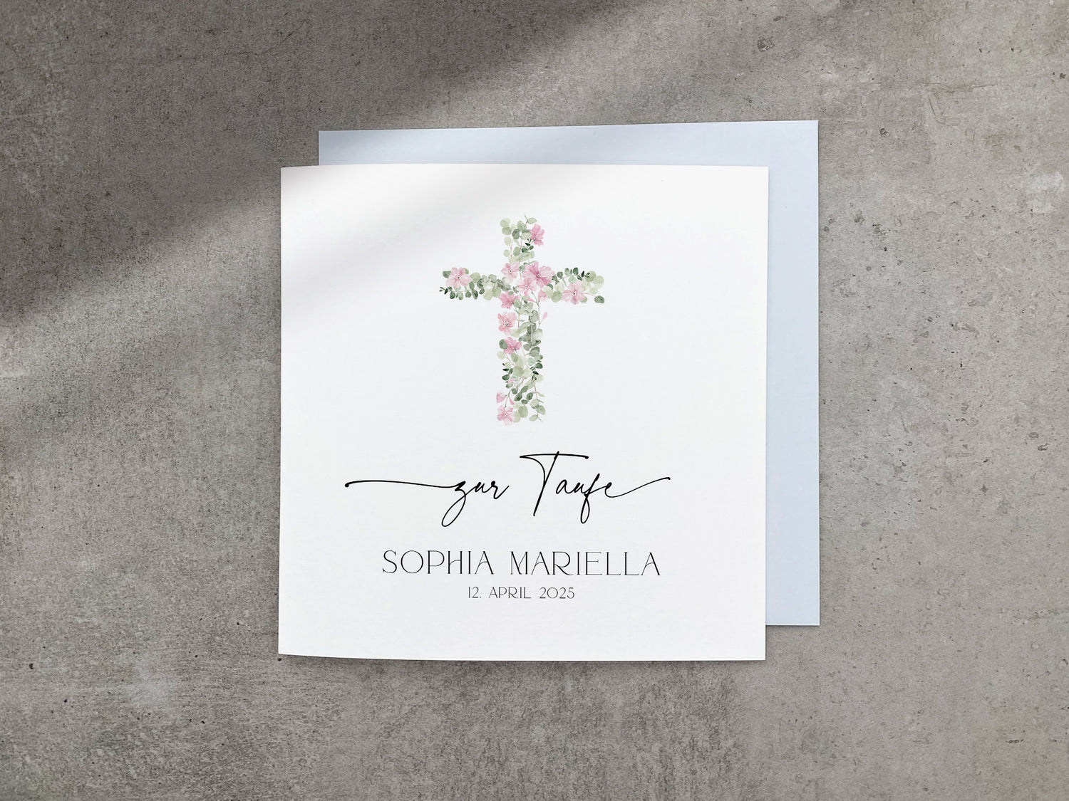 Du kannst die Karte mit dem Namen des Täuflings personalisieren lassen. Wenn du möchtest kannst du auch das Taufdatum dazu schreiben. Schreibe mir deine Wünsche einfach in das Personalisierungsfeld rein.